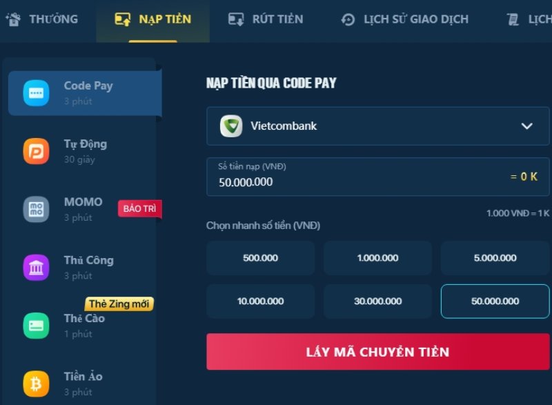 Mỗi hội viên có thể chọn một trong nhiều phương thức khác nhau để gửi tiền vào tài khoản chơi. Hiện nay, đơn vị đã thực hiện liên kết với nhiều hệ thống ngân hàng khác nhau và có các kênh nạp tiền gồm: Ngân hàng, ví điện tử, thẻ cao, tiền ảo.